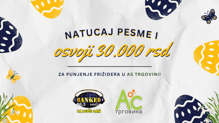 U susret Uskrsu, BANKER radio i ove godine daruje najvernije slušaoce! Pripremili smo ti muzički kviz „Natucaj pesme i osvoji punjenje frižidera“ u vrednosi od 30.000 dinara za veliku Uskršnju kupovinu u AS Trgovini, da praznična trpeza bude bogata!Šta osvajaš?Pobednik igre osvaja vaučer u iznosu od čak 30.000 dinara za kupovinu…